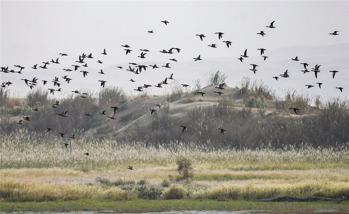 九月,秋意渐浓,在葡萄丰收的古阳关下,天马故乡渥洼池内百鸟嬉戏、自由翱翔。(王斌银 马燕 何娇娇)