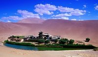 在鸣沙山下,古称沙井,俗名药泉,景区内的罗布麻、枸杞等药材很多,自汉朝起即为“敦煌八景”之一,得名“月泉晓彻”。月牙泉南北长近100米,东西宽约25米,泉水东深西浅,最深处约5米,弯曲如新月,因而得名,有“沙漠第一泉”之称。 月牙泉有四奇:月牙之形千古如旧、恶境之地清流成泉、沙山之中不淹于沙、古潭老鱼食之不老。去鸣沙山、月牙泉游玩以傍晚、黄昏时分最佳。陈运和诗赞这儿:“月牙泉是鸣沙山的逗点 鸣沙山是月牙泉的余音 终于,戈壁上才出现成功者的合演”。