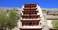 莫高窟又称“千佛洞”,位于敦煌县城东南25公里的鸣沙山下,因地处莫高镇而得名。它是我国最大、最著名的佛教艺术石窟。分布在鸣沙山崖壁上三四层不等,全长一千六百米。现存石窟492个,壁画总面积约45000平方米,彩塑佛像等造型2100多身。石窟大小不等,塑像高矮不一,大的雄伟浑厚,小的精巧玲珑,其造诣之精深,想象之丰富,是十分惊人的。