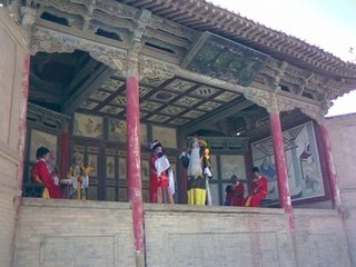 戏台是清乾隆五十七年(1792年)嘉峪关游击将军袋什衣主持修建, [嘉峪关景观] 系当时守城官兵、城内居民及过往商旅的娱乐场所。其形制为典型的中国传统古典戏台。由木制屏风把前后台分隔开,屏风正中央绘制八幅人物图,是人们熟知的“八仙”内容。顶部为中国传统图案“八卦图”,“八卦图”是中国古代思想文化与科学的综合反映。两侧是一组风情壁画,内容是寺庙的和尚及尼姑庵的尼姑及尼姑豢养的宠物。这些绘画内容在其它戏台上是非常少见的。戏台两侧书写有对联:“离合悲欢演往事,愚贤忠佞认当场”。对联高度概括了古往今来人间世事的演义变化及戏曲演出场所的功能作用。