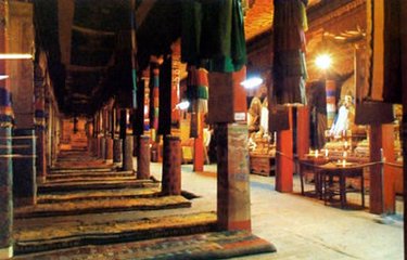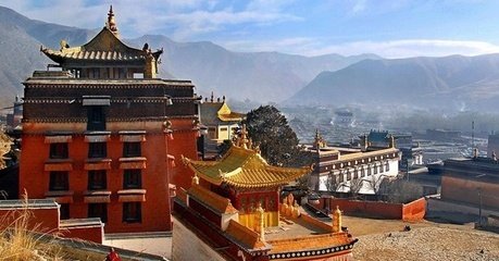 拉卜楞寺位于夏河县城西0.5公里处。本名噶丹夏珠卜达吉益苏奇贝琅,简称扎西奇寺,是藏传佛教格鲁派(黄教)六大寺院之一。寺院坐北向南,占地总面积86.6万平方米,建筑面积40余万平方米,主要殿宇90多座,包括六大学院、16处佛殿、18处昂欠(大活佛宫邸)、僧舍及讲经坛、法苑、印经院、佛塔等。拉卜楞寺宗教体制的组成以闻思、医药、时轮、吉金刚、上续部及下续部六大学院为主,在全蒙藏地区的寺院中建制最为健全。闻思学院是其中心,又称大经堂,有前殿楼、前庭院、正殿和后殿共数百间房屋,占地十余亩,为藏式和古宫殿式的混合结构,顶上有鎏金铜瓦、铜山羊和法轮、幡幢、宝瓶等装饰物。