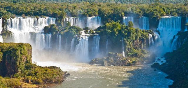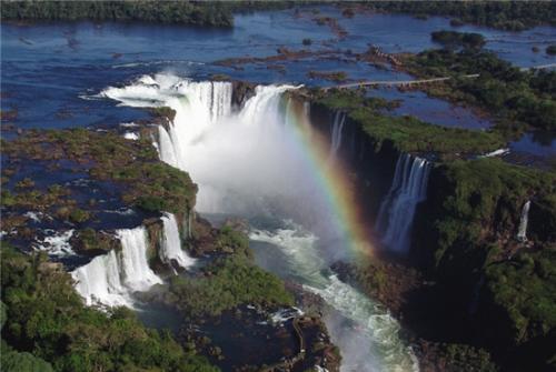 伊瓜苏瀑布位于巴西和阿根廷交界。与维多利亚瀑布和尼加拉瓜瀑布不同,伊瓜苏瀑布并不是一面长长的水幕,而是湍急的伊瓜苏河“遭遇”峡谷,而形成彼此相联的大大小小若干个瀑布。许多个别瀑布在中途被突出的岩石击破,使水流偏转而水花飞溅升腾,产生如彩虹幔帐般的景色。从瀑布底部向空中升起近152公尺(500呎)的雾幕与彩虹辉映,蔚为奇观。