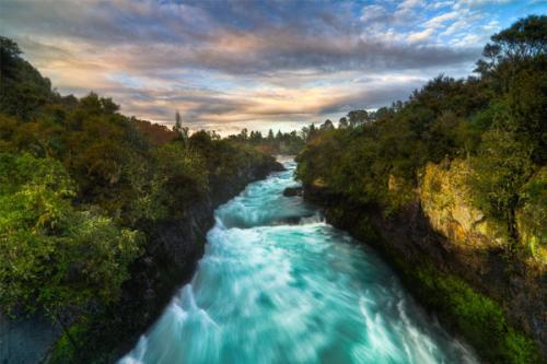 新西兰境内有很多瀑布,胡卡瀑布因其独特的宝石蓝色才脱颖而出。是新国最受欢迎的自然景观之一。胡卡瀑布水量充沛、气势磅礴,是绝佳的拍照地点。怀卡托河由12公尺高的河道断层冲泻而下,造成每秒230吨巨量的水流,浅蓝如宝石的怀卡托河因隘口及断层的作用,产生喷射及向下的巨大动力,形成泡沫般的水瀑渲泻而下,故当地人称此瀑布为“Huka”,也就是泡沫的意思。