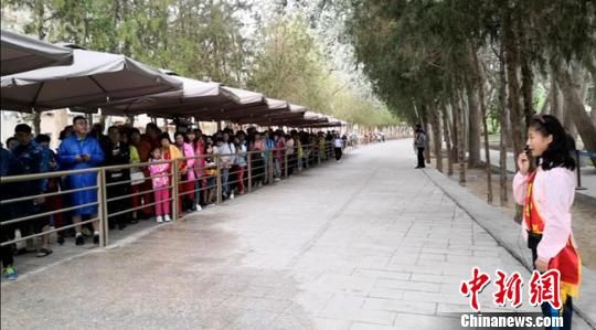 今年暑期以来,敦煌莫高窟游客量持续“爆棚”。尤其是8月以来,连续多日40℃上下的高温炙烤中,每天蜂拥而至的客流“洪峰”在莫高窟前排成近1公里的长队,并要经过较长时间排队等候。在此间隙,来自敦煌市经层层选拔的160名小学生现场客串“小小讲解员”,用清脆悦耳的童声向游客讲述家乡文化。